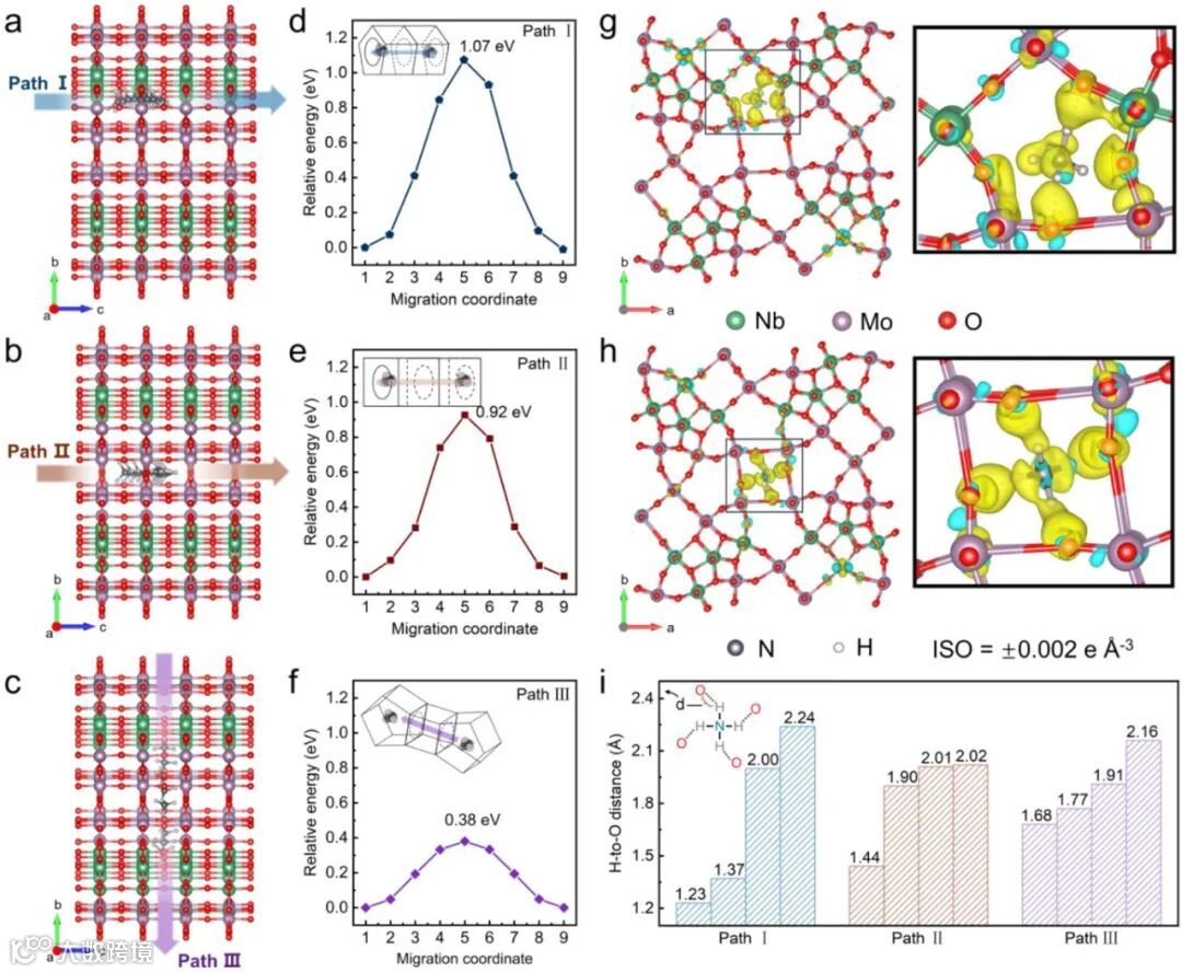 DFT计算清晰比较了NH₄⁺在三种隧道中的迁移路径与能垒。发现跨腔扩散路径(Path III)能垒最低(0.34 eV),其氢键作用最弱,最有利于NH₄⁺快速迁移。揭示了隧道形状与氢键拓扑结构的匹配是调控动力学的关键。
