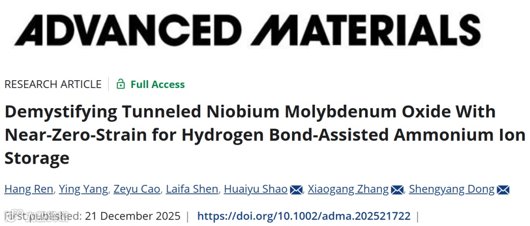 Hang Ren, Ying Yang, Zeyu Cao, Laifa Shen, Huaiyu Shao, Xiaogang Zhang, Shengyang Dong. Demystifying Tunneled Niobium Molybdenum Oxide With Near‐Zero‐Strain for Hydrogen Bond‐Assisted Ammonium Ion Storage. Advanced Materials, 2025.
