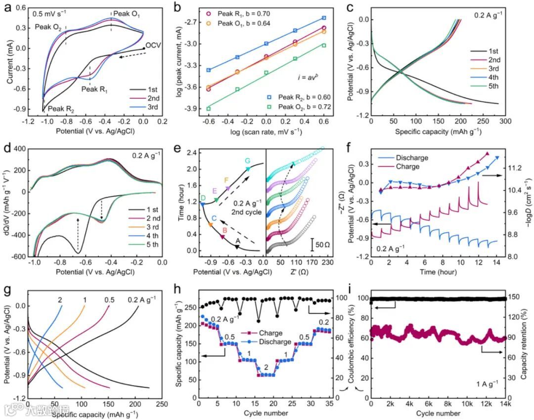 超长循环寿命:在20 m乙酸铵电解液中,该负极在1 A g⁻¹的大电流下循环14,000次后,容量保持率仍达88.9%,稳定性远超同类材料。