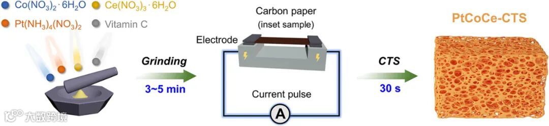 秒级合成:CTS 超快焦耳加热(0.25 s 加热 + 2.75 s 冷却)抑制金属团聚,一步生成 PtCoCe 三元氧化物。