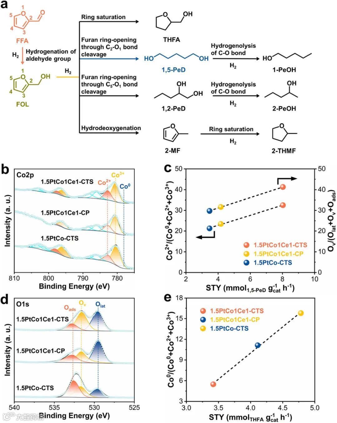 XPS:Co²⁺ 占比、氧空位浓度均与 1,5-PeD 选择性线性相关。