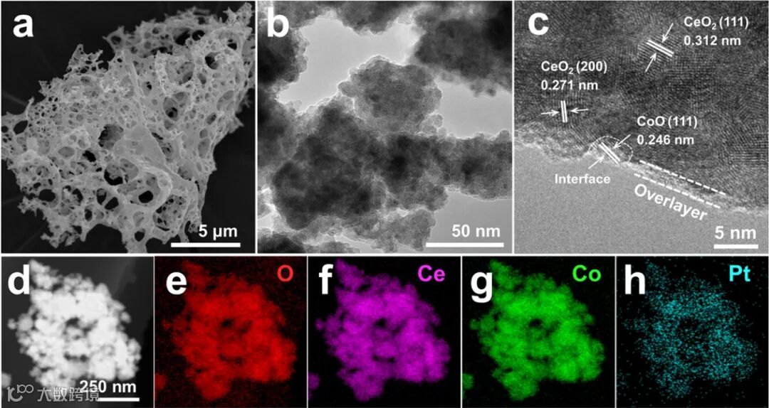 SEM/TEM:泡沫状多孔骨架;HRTEM 中 CoO(111) 0.246 nm、CeO₂(200) 0.271 nm 共存,2 nm 非晶层包覆抑制相变。