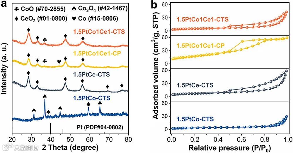 XRD:Ce 引入后 Co 以 CoO(36.9°, 44.2°)存在,无 Ce 则出现 Co₃O₄。