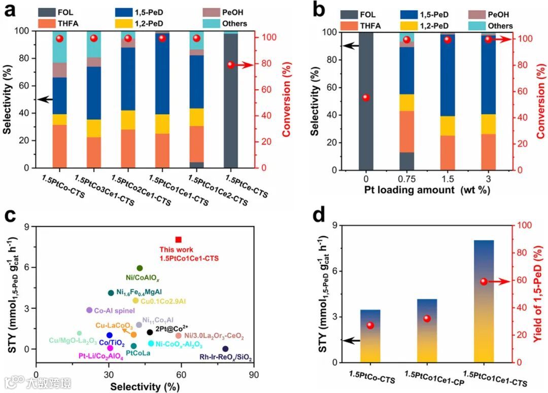 Co/Ce = 1:1 时 1,5-PeD 选择性 59.2 %;Pt 负载 1.5 wt % 达性能平台。
