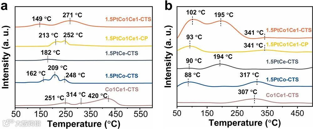 H₂-TPR:Pt 促进 Co₃O₄→CoO 还原峰降至 149 °C。