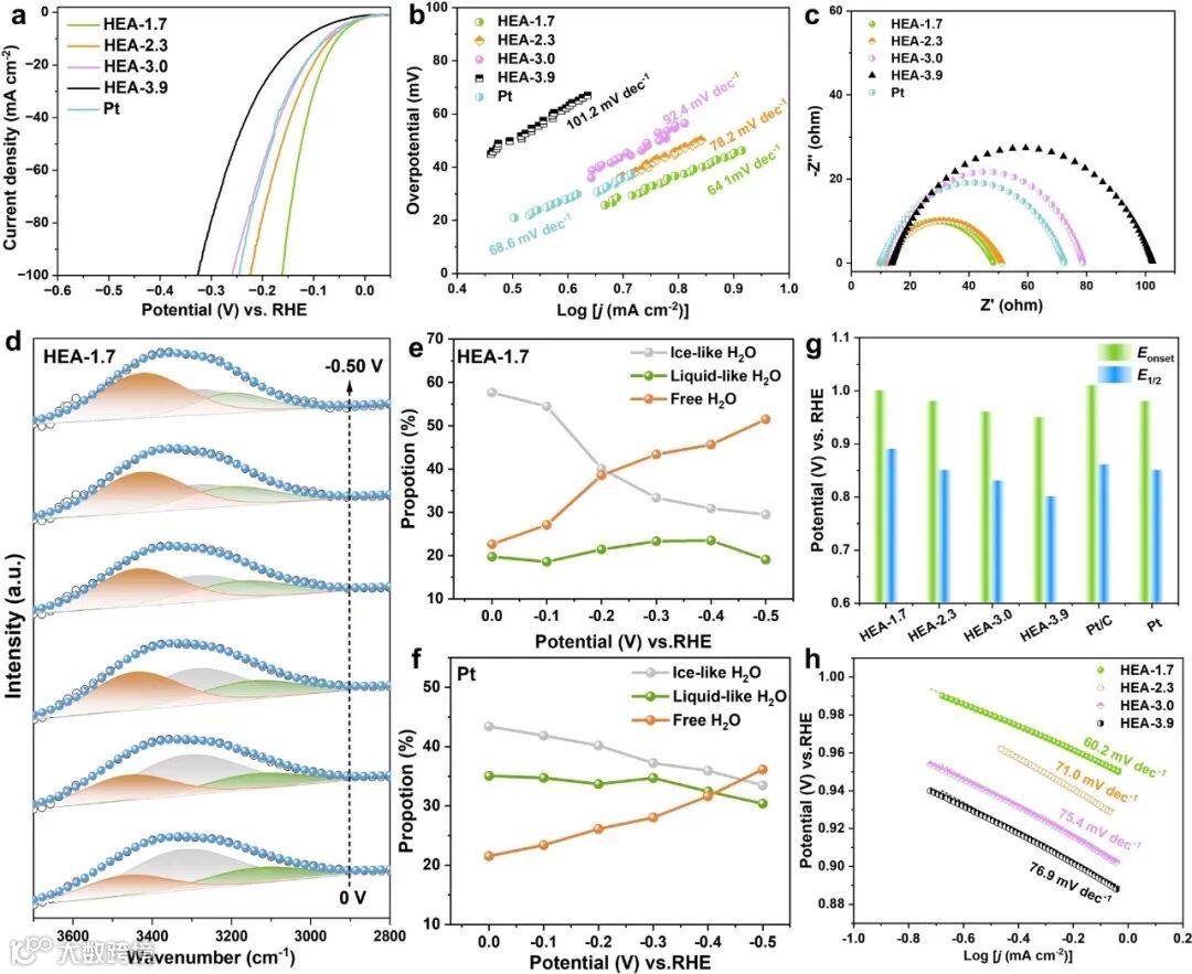 1.7 nm HEA 在酸性 HER 中展现超低过电位和超高质量活性,碱性 HER 和 ORR 性能测试也充分证明小尺寸 HEA 颗粒优势,凸显尺寸效应关键作用。