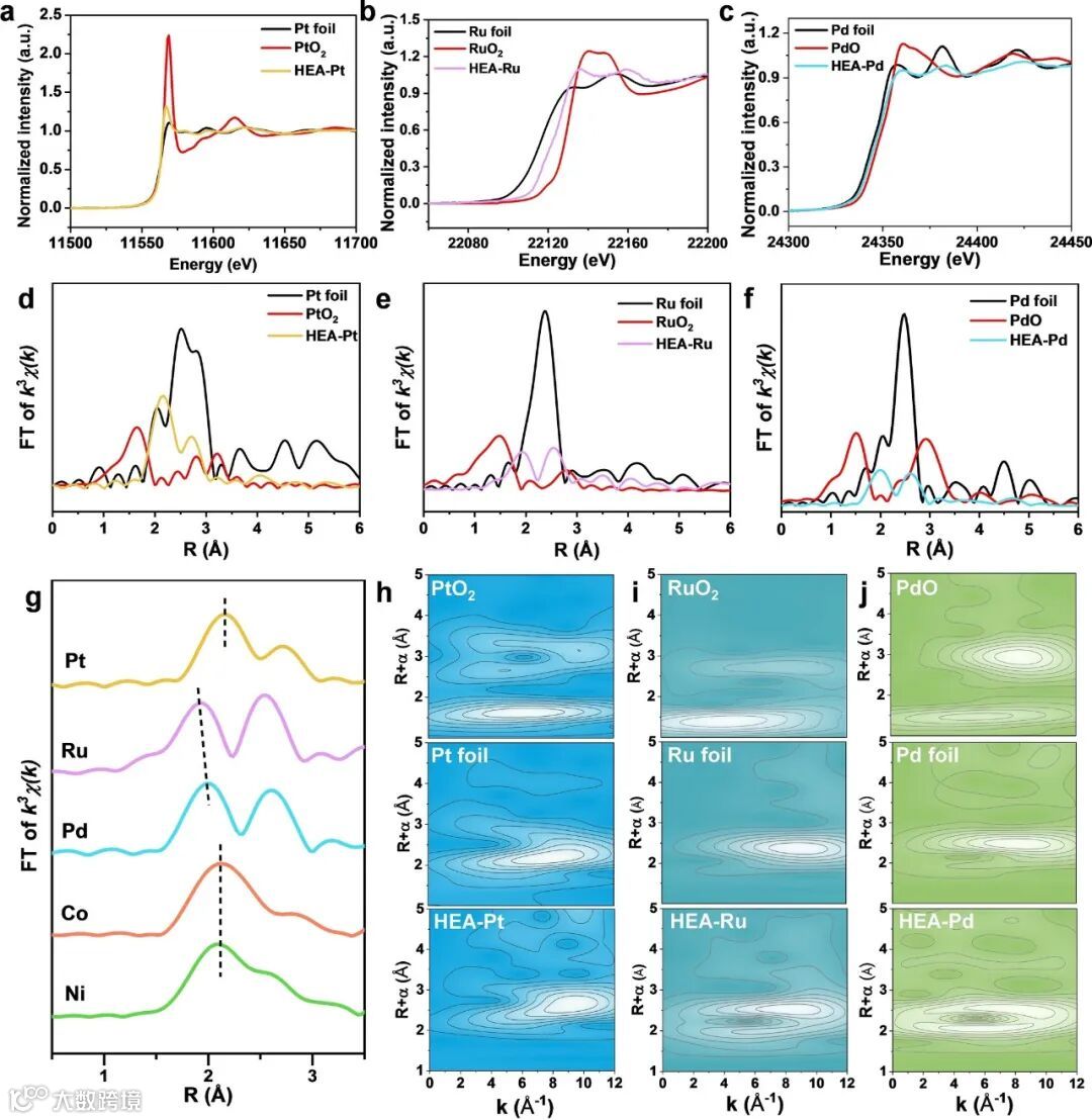 XPS 显示 Co/Ni 主要呈 +2 价,Pt/Ru/Pd 以金属态为主,印证电子转移机制。XAS/EXAFS 分析揭示关键配位环境,证实原子级均匀混合,为催化剂高性能提供结构支撑。