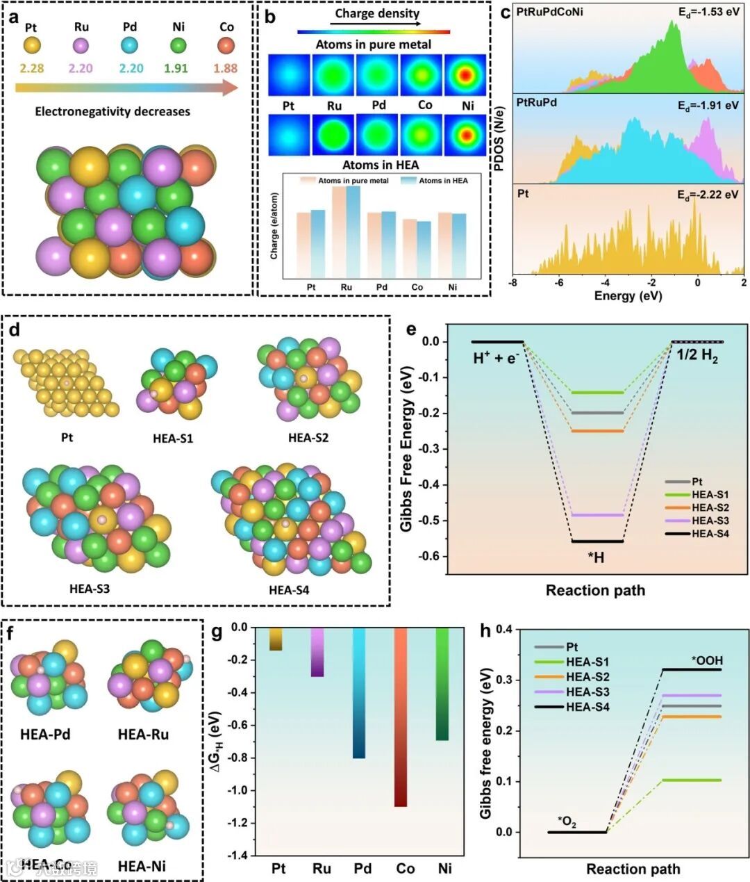 利用电负性分析和 Bader 电荷计算,发现 Co/Ni 向贵金属电子转移使 Pt 的 d 带中心降低,削弱反应中间体过强吸附。理论计算进一步揭示尺寸效应,1.7 nm HEA 的 H 吸附能接近理论最优值,O₂→*OOH 能垒降低,表明小尺寸通过改变几何构型与电子态协同降低反应能垒。