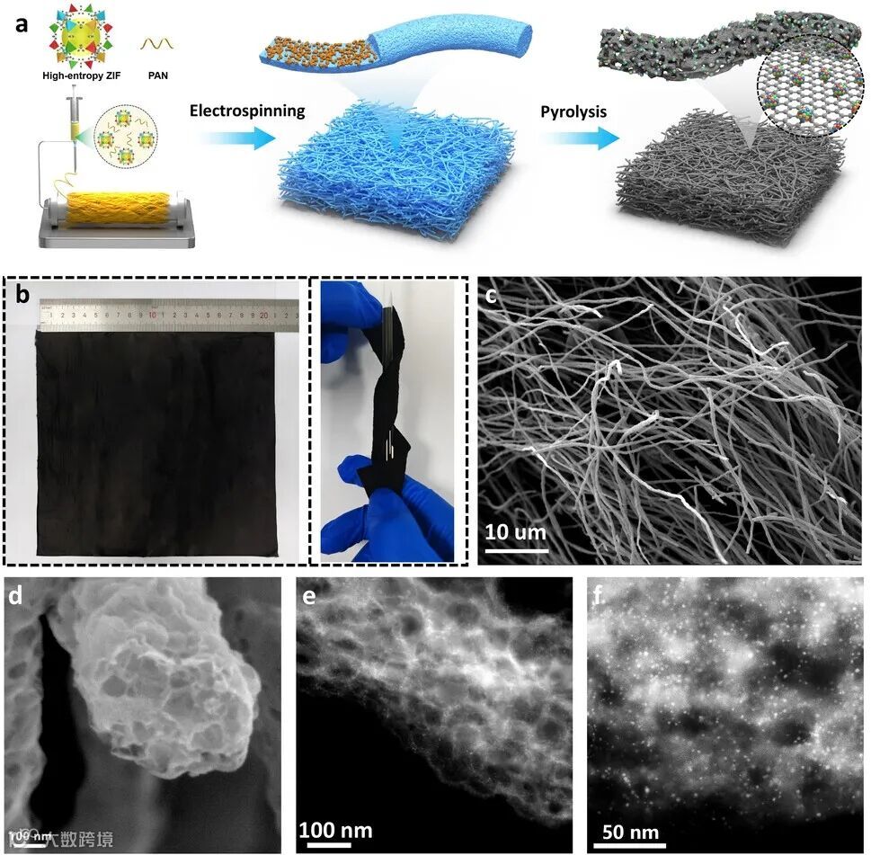 创新性地将金属离子限域于 ZIF - 8 框架,电纺 PAN 纤维后碳化,借助 MOF 孔道和碳基质抑制高温原子扩散,制备出自支撑多孔碳膜负载 HEA。球差电镜表征确认获得均匀分散的 1.7/2.3/3.0/3.9 nm 纳米颗粒,突破尺寸瓶颈。AC-HAADF-STEM 与 EDX 证实 1.7 nm 颗粒呈 fcc 结构,元素均匀分布,形成固溶体相。
