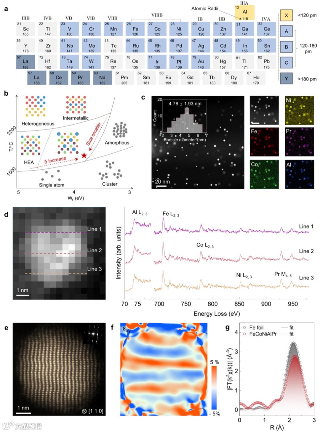 以FeCoNiAlPr为例(图2c),HAADF-STEM显示~4.8 nm的颗粒均匀分散在碳基底上,EDS面扫显示五种元素分布高度一致——单相固溶,没偏析。