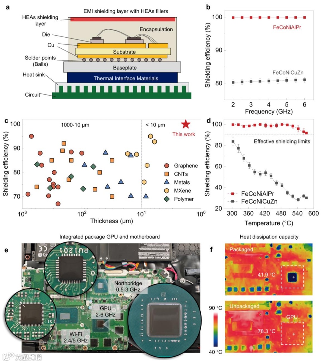 把这FeCoNiAlPr纳米颗粒加10 wt%到硅胶里,涂成~1.8微米的超薄层,在5G频段(2-6 GHz)实现~99.9%的电磁屏蔽效能(图4b)。
