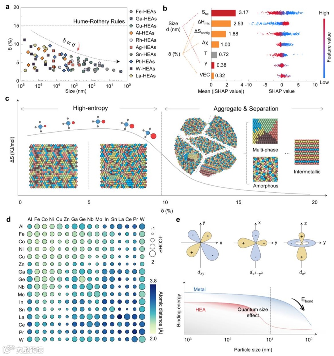先看图1。图1a统计了文献里的纳米HEA,δ因子基本都在15%以下,而且颗粒越小,δ越低——尺寸效应把高δ合金的路堵死了。