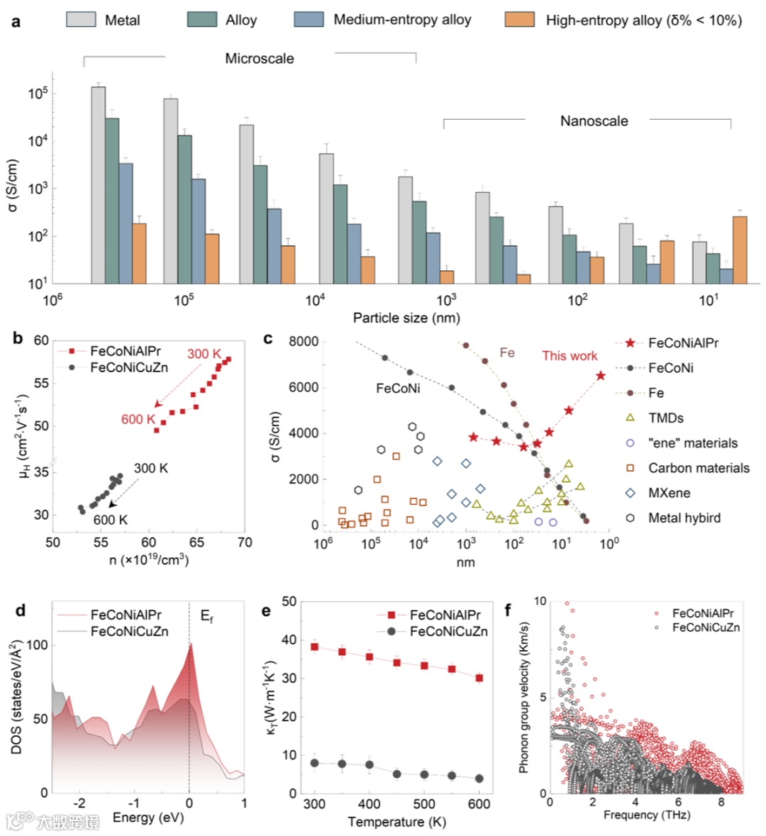 图3c和文献值对比,纳米尺度下,FeCoNiAlPr的电导率已经和块体贵金属(Ag、Au)相当——纳米材料追平块体贵金属,这事不常见。