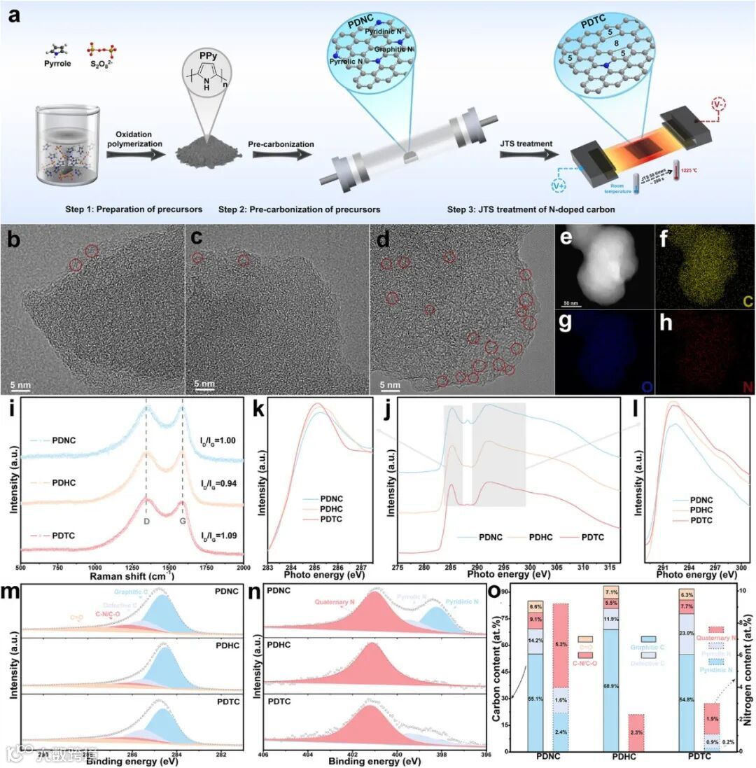 通过高分辨电镜、拉曼光谱、X射线吸收谱等系统表征,对比了焦耳热冲击法(PDTC)与传统方法所得材料的结构差异。结果表明,PDTC材料具有最高的缺陷密度(拉曼ID/IG比最高),石墨微晶最少,且残留氮以高稳定性的季氮为主。这共同证实了焦耳热冲击在实现高效脱氮的同时,成功抑制了碳骨架的有序化重排,构筑出富含拓扑缺陷的独特结构。