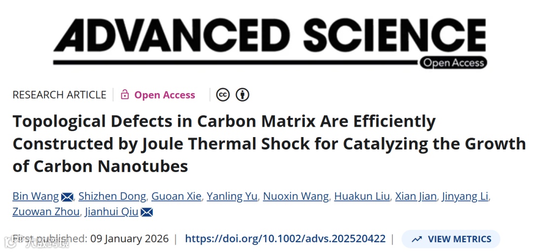 Bin Wang, Shizhen Dong, Guoan Xie, et al. Jianhui Qiu*. Topological Defects in Carbon Matrix Are Efficiently Constructed by Joule Thermal Shock for Catalyzing the Growth of Carbon Nanotubes. Adv. Sci. 2026.