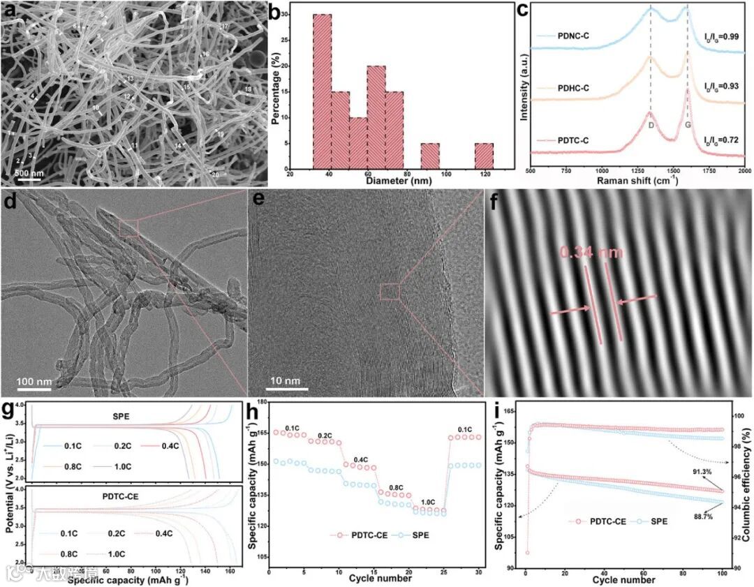 实验证明,富含拓扑缺陷的PDTC材料能高效催化乙炔生长出直径30-80 nm的多壁碳纳米管,产率远超对比样品。将所得碳管作为导电剂应用于磷酸铁锂正极,其倍率性能、循环稳定性和导电性均优于商用Super-P,直接展示了其在提升锂离子电池性能方面的应用价值。