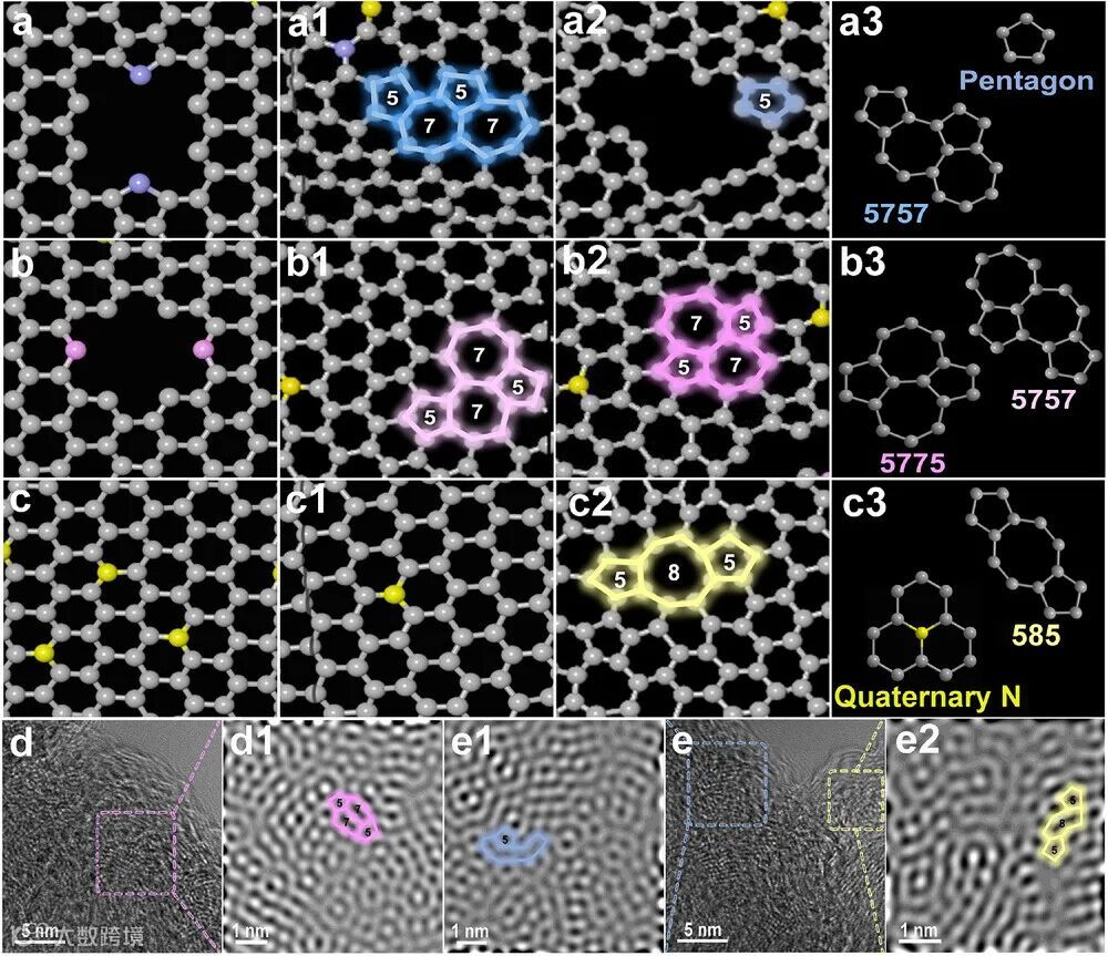 利用反应力场分子动力学模拟了焦耳热冲击下氮掺杂结构的演化路径,预测会形成含五元环、七元环(如5775)及八元环(585)的多种拓扑缺陷。先进的像差校正透射电镜直接观测到了这些预测的缺陷结构,模拟与实验结果高度吻合,从原子尺度确证了焦耳热冲击构建特定拓扑缺陷的能力与可靠性。