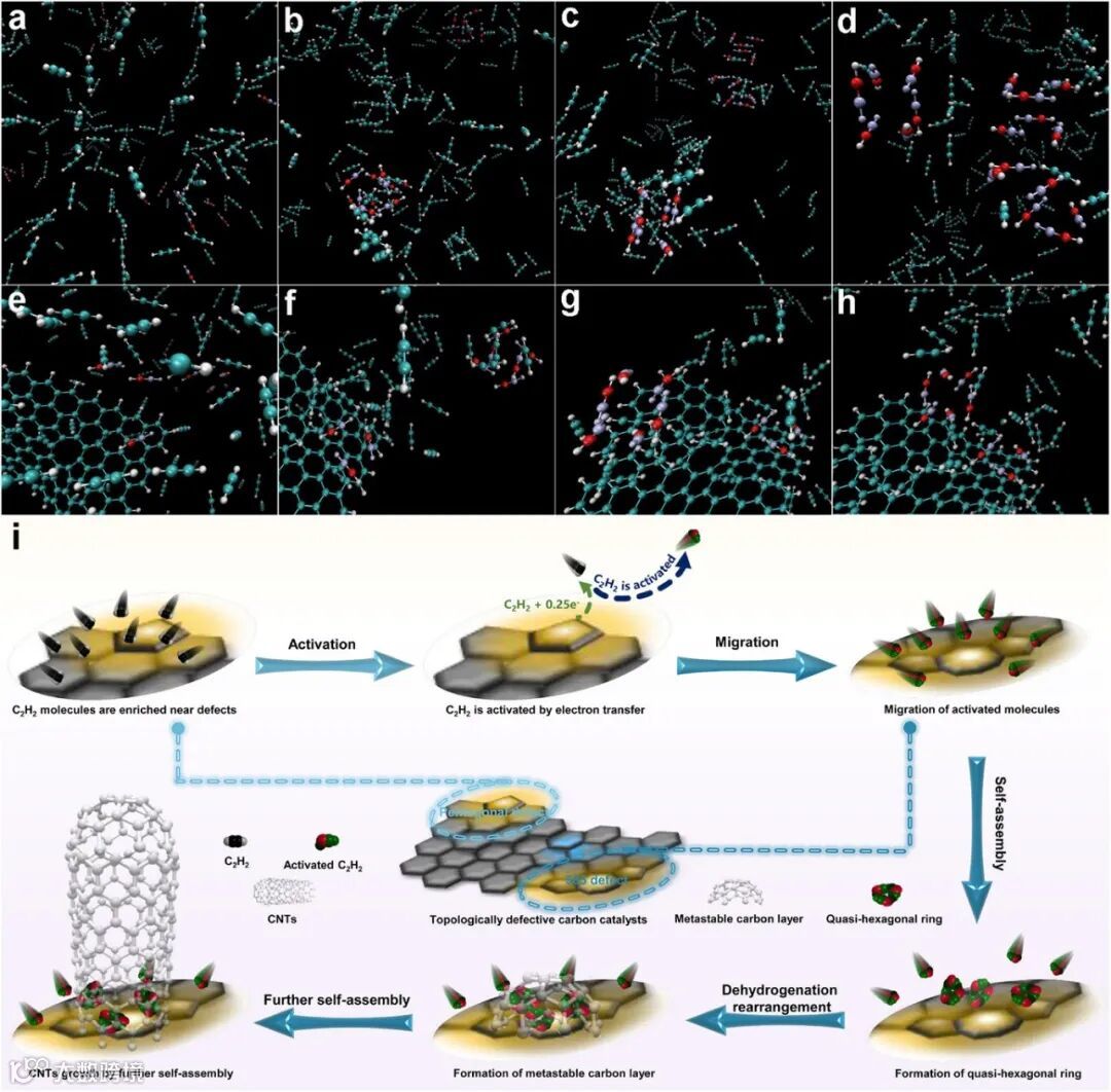 结合分子动力学模拟与实验表征,研究提出了完整的非金属催化生长机制:被五元环缺陷活化的碳源分子,在具有一定曲率的其他缺陷(如585、5775)表面发生自组装,形成准六元环网络;随后经脱氢、重排形成初始碳层;生长最终通过碳层边缘的持续自组装进行。该机制为理性设计非金属碳催化剂提供了清晰的理论框架。