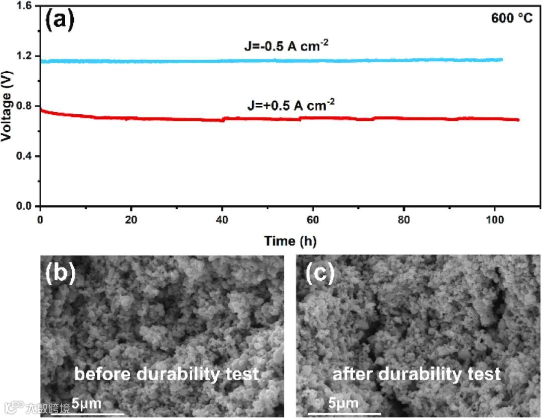 • ±0.5 A cm⁻² 循环 100 h 电压衰减 <1 %;SEM 显示 HTS-BF 微观结构无明显裂纹或颗粒粗化。