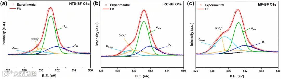 • HTS-BF 晶格氧(Olatt)/吸附氧(Oads)比值最低,表面活性氧比例升高,有利于 OER/ORR 中间体吸附。