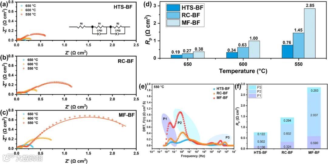 • HTS-BF 在 550–650 °C 区间极化电阻最低;DRT 解析表明氧空位促进表面交换与体相扩散(P1–P3 峰显著降低)。