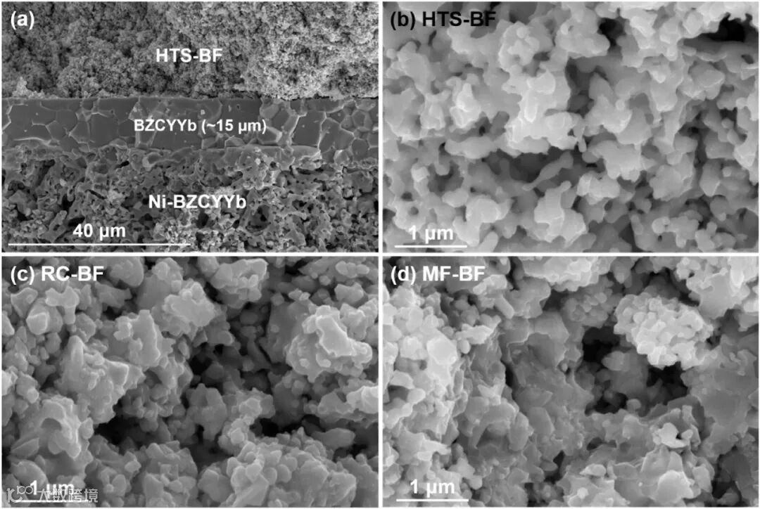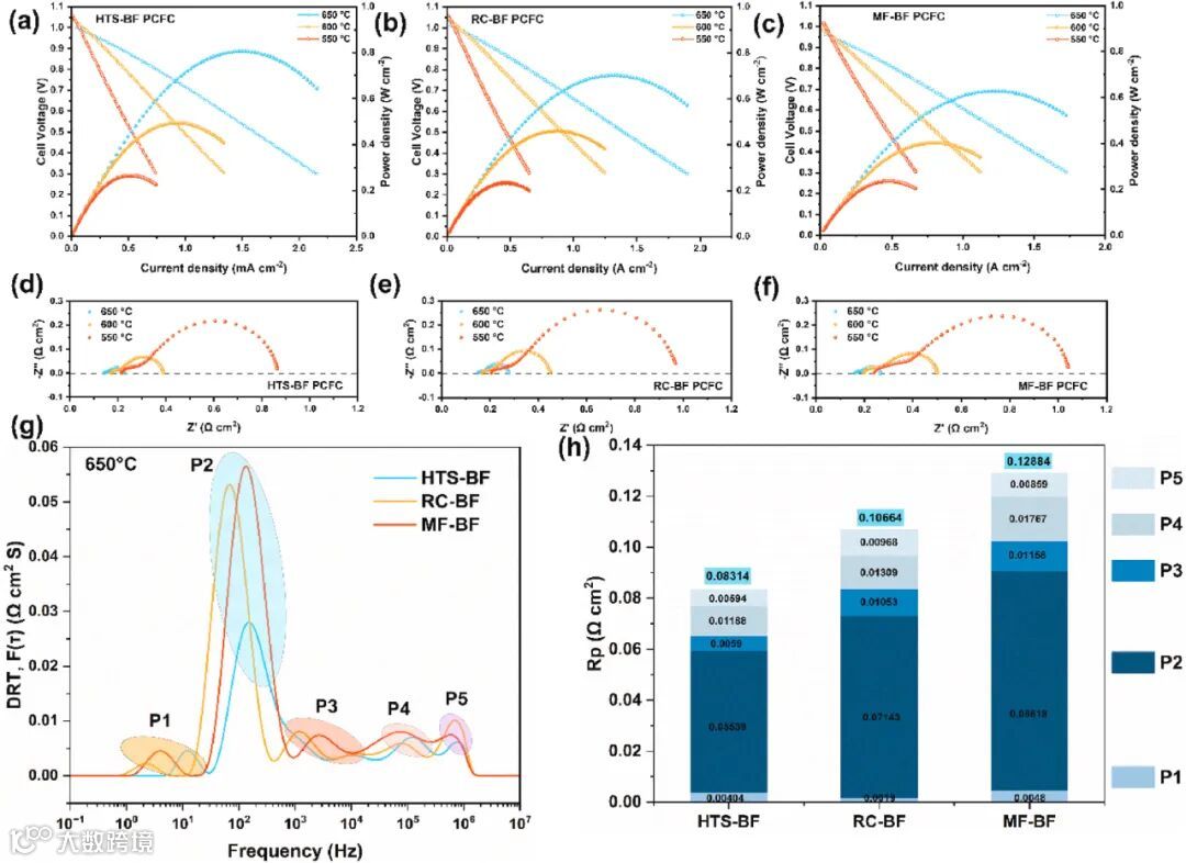• PCFC 模式:650 °C 峰值功率 0.806 W cm⁻²(HTS-BF) vs 0.55 W cm⁻²(RC-BF)。