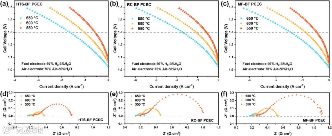 • PCEC 模式:1.3 V 电流密度 1.654 A cm⁻²,欧姆阻抗降低约 35 %。