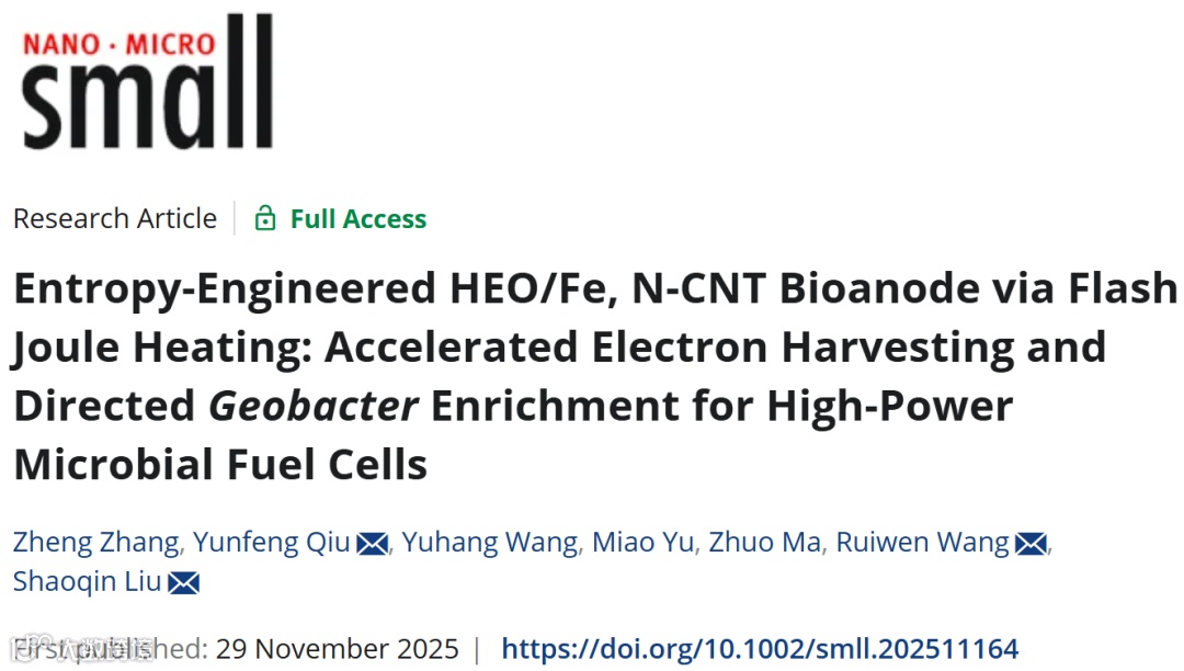 将有机废水直接转化为电能的神奇技术迎来革命性升级!哈尔滨工业大学刘绍琴教授、邱云峰教授及东北林业大学王睿文副教授团队在材料科学顶级期刊《Small》上发表里程碑研究成果。该研究通过闪蒸焦耳加热技术,首次构建了五元高熵氧化物/碳纳米管复合生物阳极,实现了3.76 W m⁻²的创纪录功率密度,较现有技术提升9.6%!这项突破不仅将微生物燃料电池的发电效率推向新高度,更为有机废弃物资源化与低碳能源生产提供了全新的解决方案。