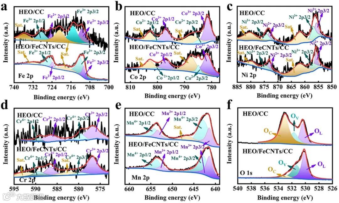 SEM/TEM显示HEO纳米颗粒均匀锚定在垂直排列的Fe、N掺杂碳纳米管表面,形成独特三维结构。XRD与SAED证实成功合成尖晶石结构高熵氧化物。XPS分析揭示多种金属元素呈多价态共存,高价态离子(如Cr⁶⁺)与细胞色素电位完美匹配;氧空位比例显著提高,为电子转移提供丰富活性位点。