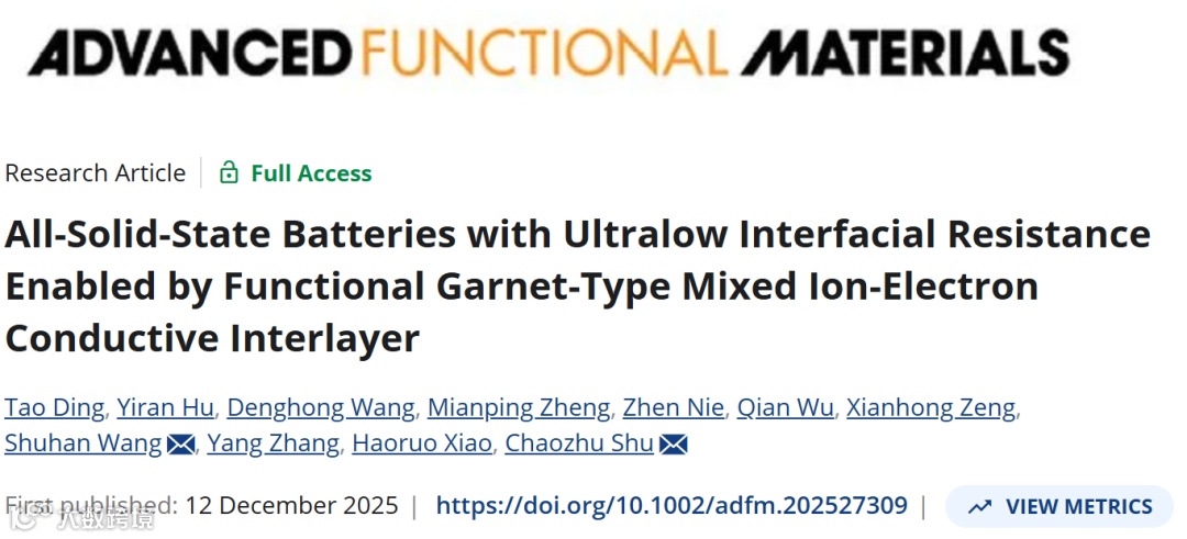 全固态电池的商业化之路,长期被固态电解质与锂金属之间糟糕的界面所阻挡。近日,成都理工大学舒朝著教授、Wang Shuhan团队在材料科学顶刊《Advanced Functional Materials》上发表重大研究成果。该团队创新性地采用 “火花等离子烧结” 技术,仅用1小时便在固态电解质表面构筑了铈掺杂的混合导电中间层。这一设计将对称电池的临界电流密度提升至3.2 mA cm⁻²,并实现了超过1200小时的稳定循环,匹配高负载正极的全电池能量密度超过370 Wh kg⁻¹,为高安全、高能量密度全固态电池的实用化扫清了一项关键障碍。