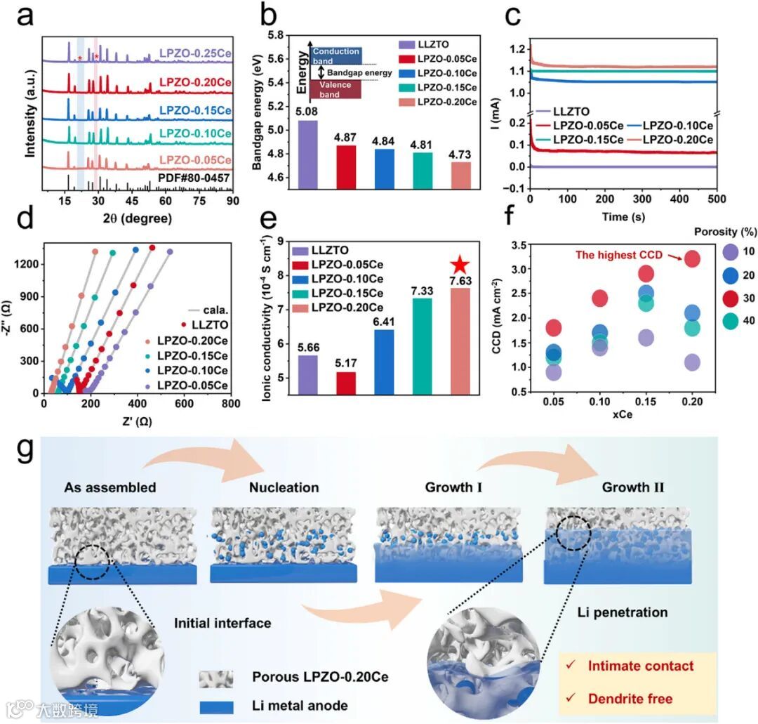 研究通过Ce⁴⁺掺杂,成功在保持立方石榴石纯相的同时,显著降低了材料的带隙。优化后的LPZO-0.20Ce材料表现出理想的混合导电特性:离子电导达7.49×10⁻⁴ S cm⁻¹,电子电导为3.48×10⁻⁵ S cm⁻¹。正是这种适度的电子电导率,使其能够引导锂离子均匀沉积,从而将对称电池的临界电流密度提升至3.2 mA cm⁻²,远超未修饰体系。