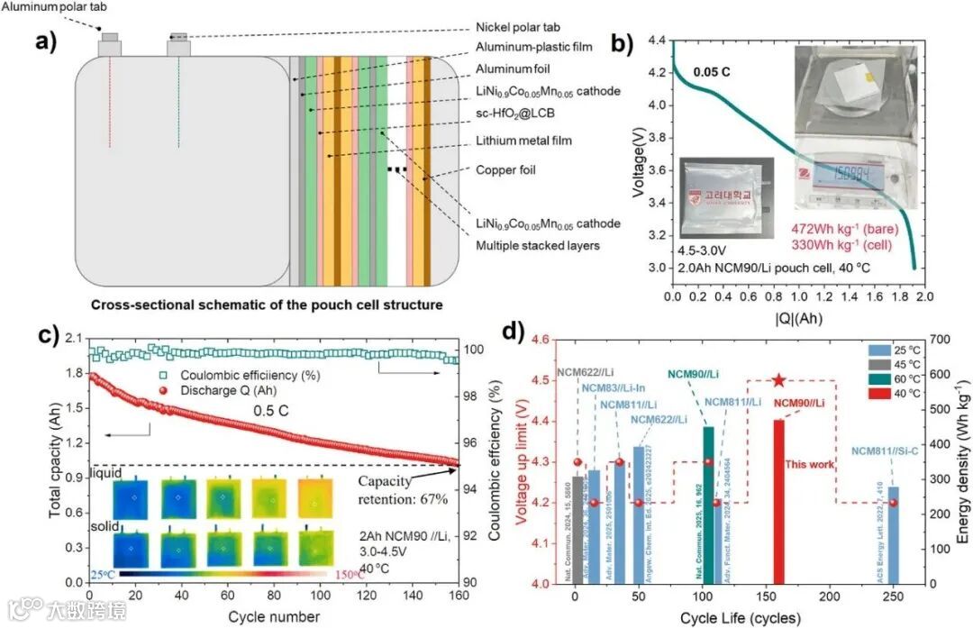 任何材料的价值,最终都要在实用化器件中体现。团队组装的2 Ah NCM90||Li软包电池在0.05C倍率下,释放出~472 Wh kg⁻¹的惊人能量密度(基于整个电芯质量)。在0.5C倍率下循环160次后,电池容量保持率依然优异。