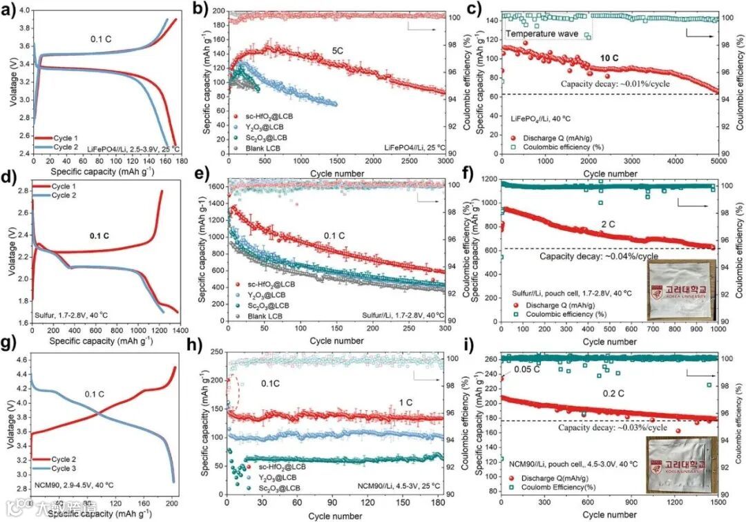 优异的电解质必须经得起真实电池环境的全面检验。研究团队在LiFePO₄、硫正极和高压NCM90这三种极具代表性的电池体系中测试了sc-HfO₂@LCB电解质。结果显示,该电解质均能大幅提升电池的循环稳定性和倍率性能,特别是在4.6V高电压下与NCM90搭配仍表现稳健,证明了其卓越的电化学稳定性。