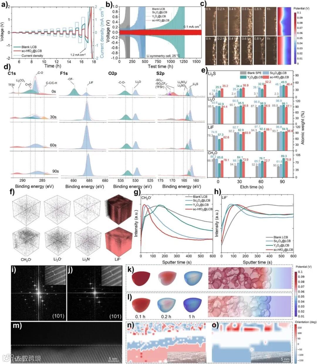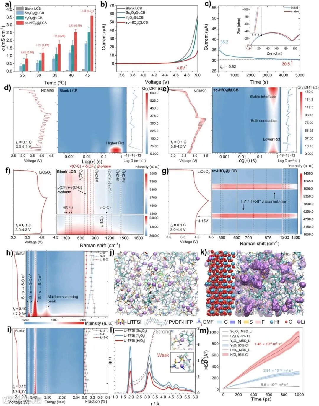 性能指标顶尖:所制备的sc-HfO₂@LCB电解质在30°C下即获得1.23 mS cm⁻¹的高离子电导率与0.82的高迁移数,并同时兼容4.8 V高电压与锂金属负极,综合性能处于领域最前沿。