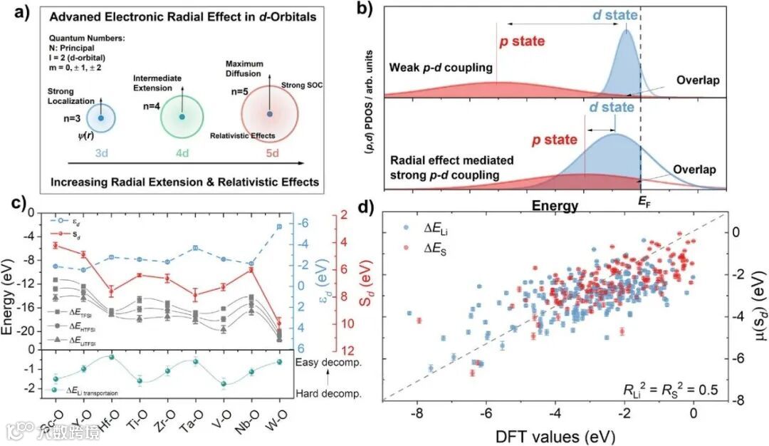 理论范式革新:突破传统d带中心理论的局限,原创性提出“径向效应”概念及熵描述符Sₐ,首次清晰阐明5d轨道相对论性扩张是降低锂离子迁移势垒的电子结构本源,为复杂体系提供了普适性极强的设计原则。