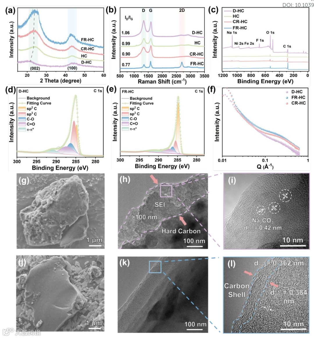 电镜更直观:失效样品颗粒胀到近11 μm,表面糊着一层厚SEI;再生完颗粒缩回7 μm,表面光溜,一层石墨化碳壳包得严实,里头还是无序结构。