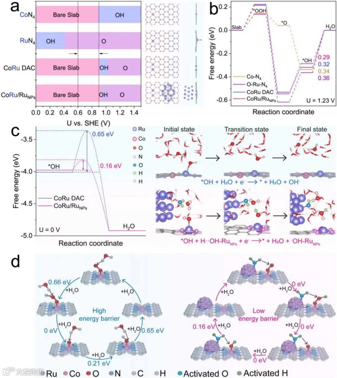 图5b的自由能图显示,Ru-Co双原子位点优化了氧中间体吸附强度,热力学过电位降下来了。