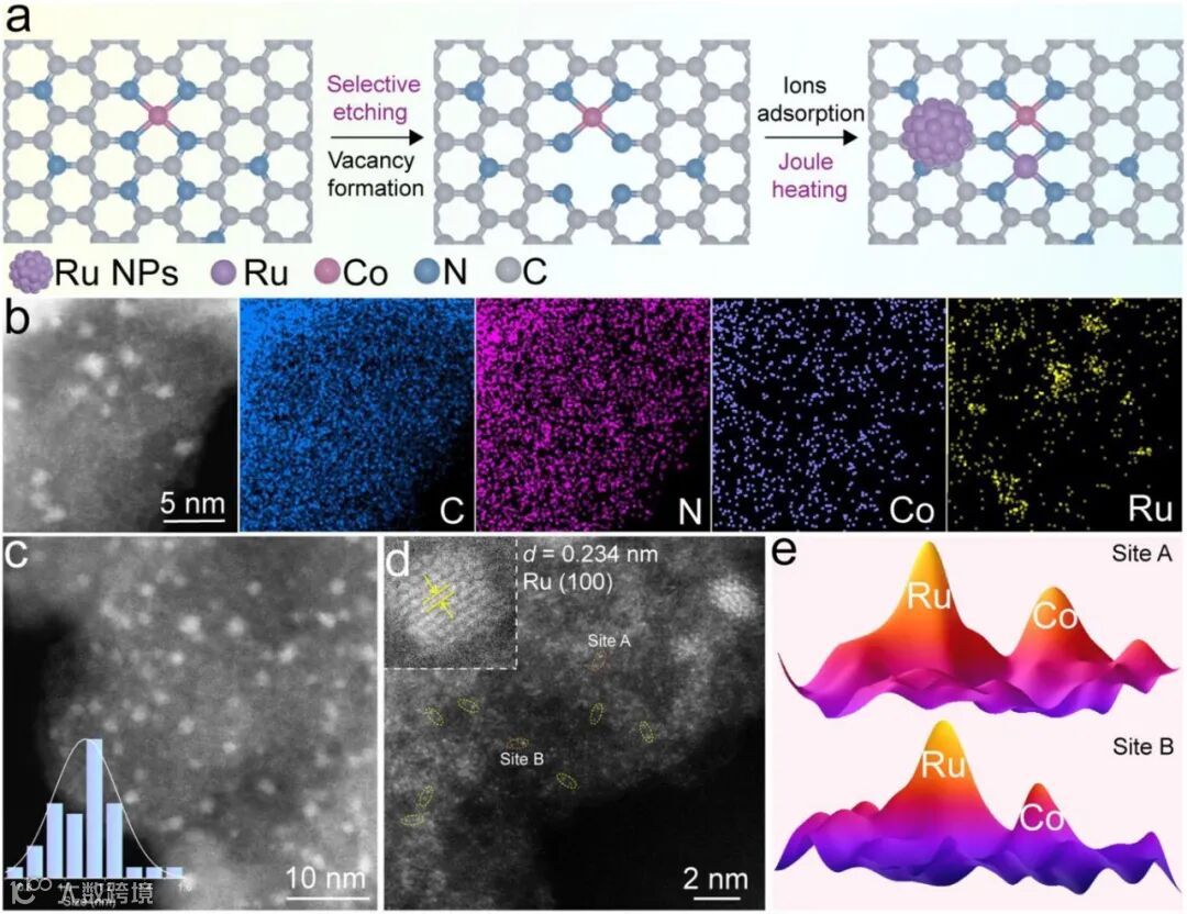 工艺层:焦耳加热,精确控制热处理,把Ru原子“团”成~1.1 nm的亚纳米团簇,又不让它们长太大,同时和Co双原子位点焊在一起。