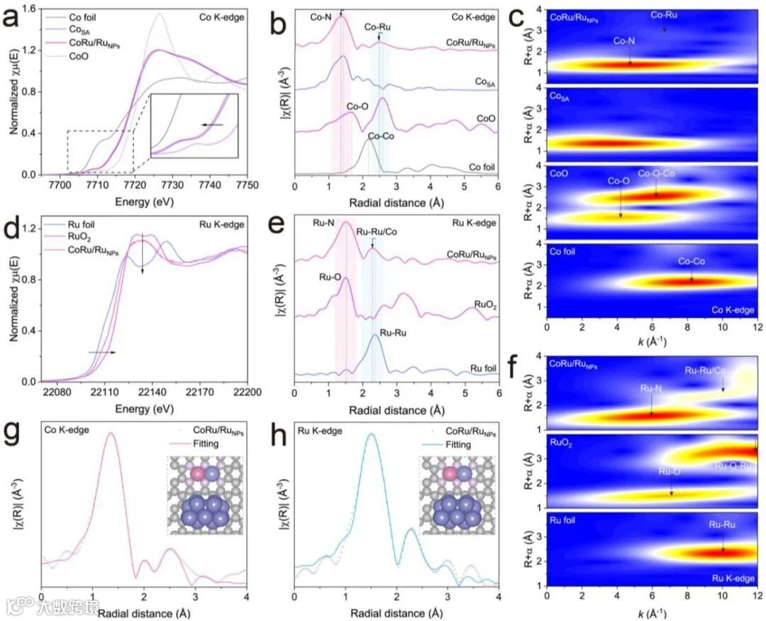 对于Ru位点,图2e除了Ru-N峰,还有2.30 Å的Ru-Ru散射峰,结合图2f的小波变换,确认了Ru亚纳米团簇的存在。图2g-h的EXAFS拟合给出了配位数,最终模型是:Ru-Co-N₆双原子位点 + 邻近Ru团簇,一个原子级“双打组合”。