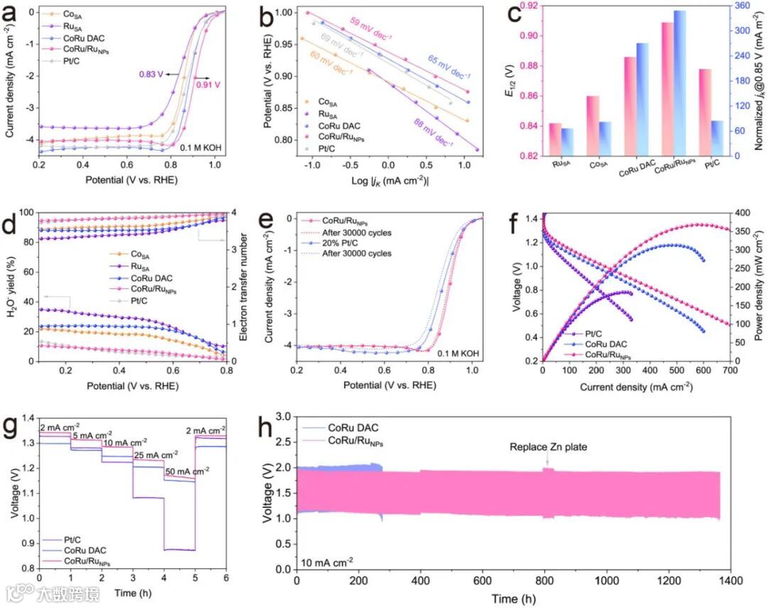 图3a,CoRu/RuNPs的半波电位0.91 V,单原子CoRu是0.89 V,商业Pt/C是0.88 V。图3b的Tafel斜率59 mV/dec,比对比样都低——反应动力学快了一截。图3c的动力学电流密度也印证了这一点。