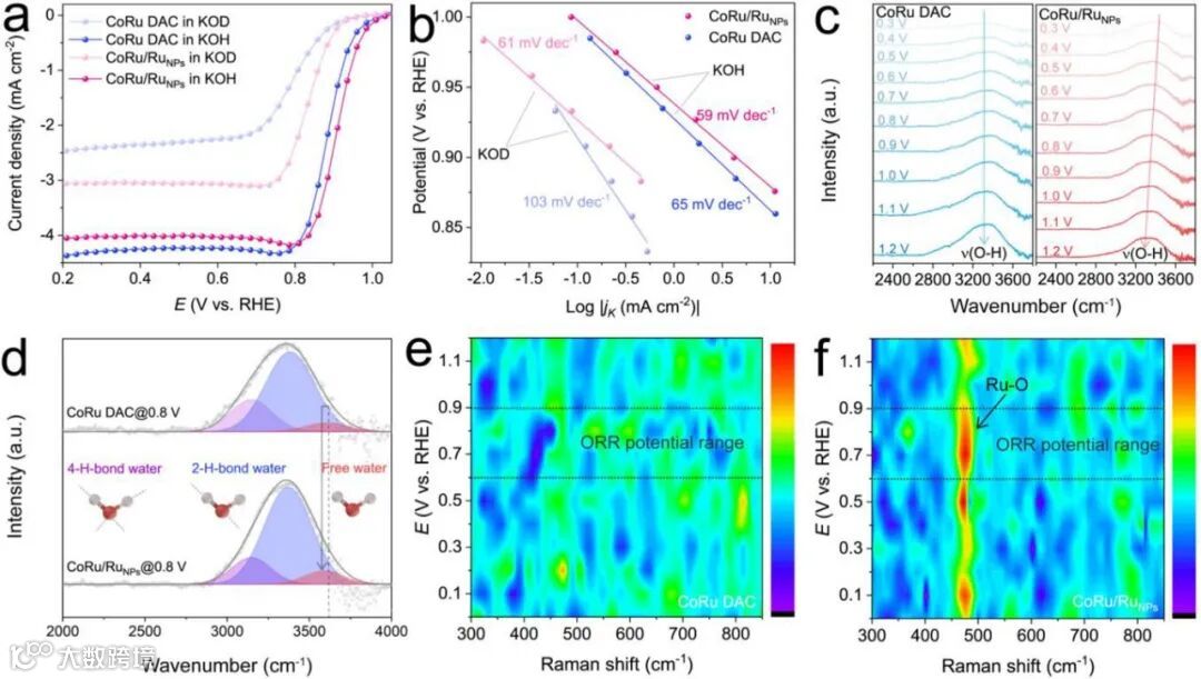 图4c的ATR-SEIRAS显示,CoRu/RuNPs上界面水的O-H振动峰随电位显著负移,说明界面水结构对电位高度敏感。图4d的高斯拟合解析出,弱氢键结合的自由水(红色组分)比例显著增加——这类自由水更容易解离,质子跑得快。