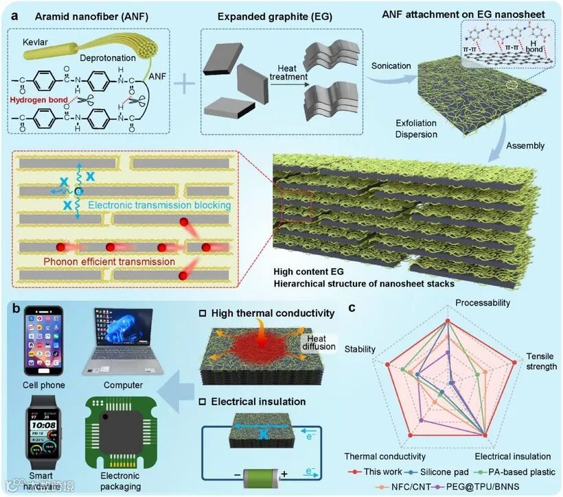 图1:a)ANF、EG和ANF/EG杂化膜的制备工艺示意图以及ANF/EG杂化膜具有高导热性和电绝缘性能的机理。b)ANF/EG杂化膜在微电子器件和电子封装中的潜在应用。