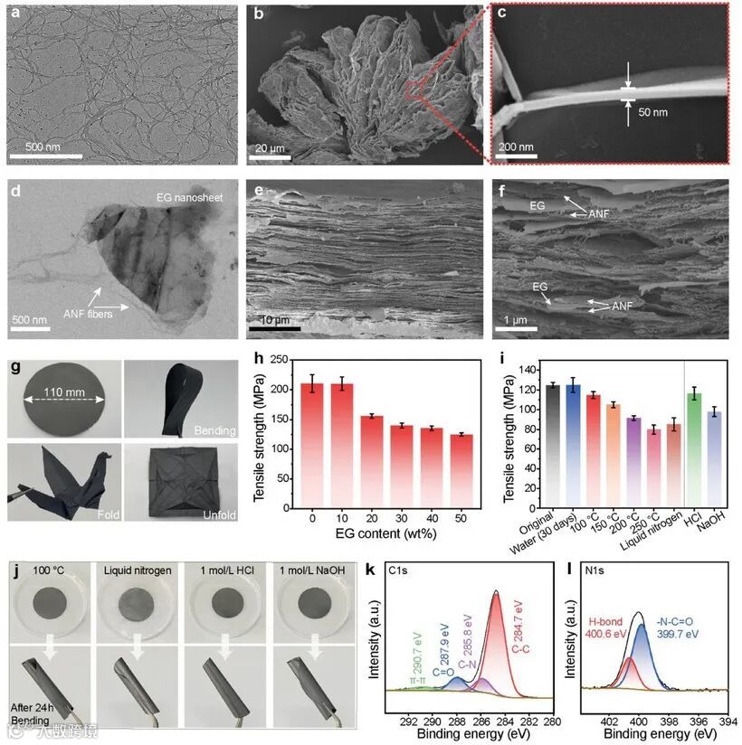 图2:a) ANF 的 TEM 图像。b、c) 热冲击获得的膨胀石墨的 SEM 图像。d) ANF/EG 混合膜的 TEM 图像。e、f) ANG/EG 混合膜的横截面 SEM 图像。
