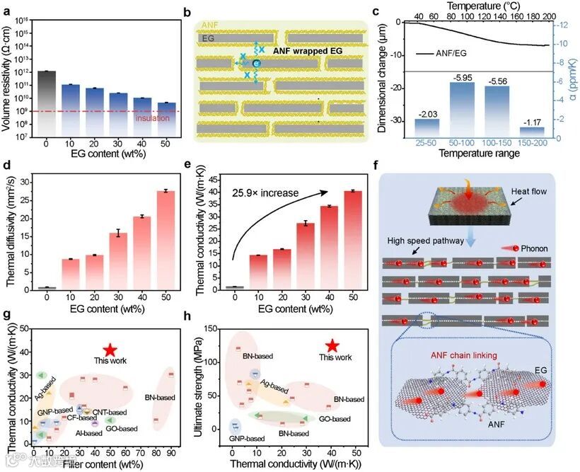 图3:a) 不同EG含量的ANF/EG杂化膜的体积电阻率(红线代表电绝缘标准(10⁹ Ω·cm))。b) ANF/EG膜的电绝缘示意图。c) 不同温度下ANF/EG杂化膜(50 wt.%)的尺寸变化和热膨胀系数。d) 不同EG含量的ANF/EG杂化膜的平面热扩散率。e) 不同EG含量的ANF/EG杂化膜的热导率。