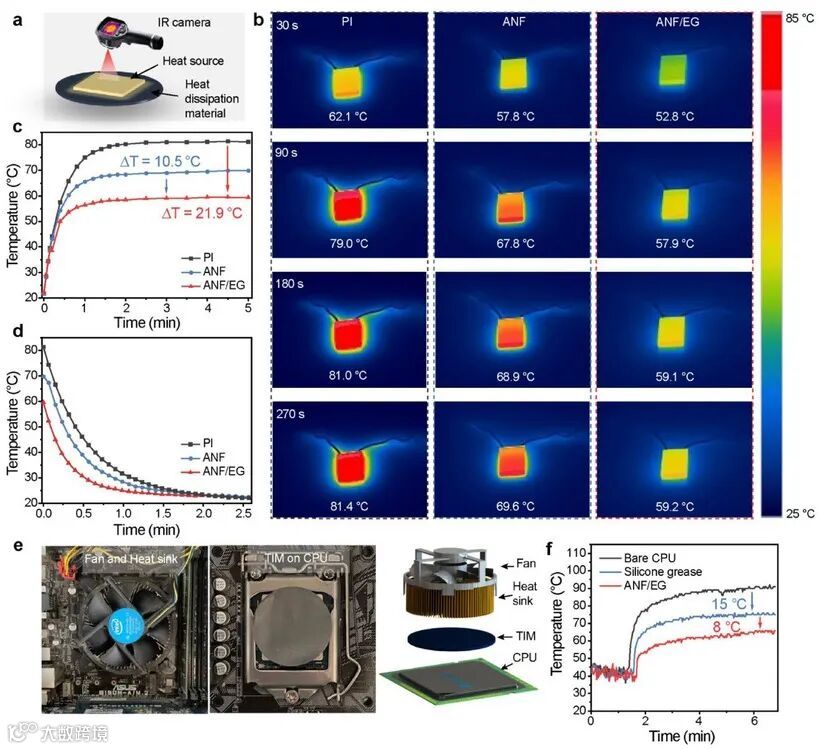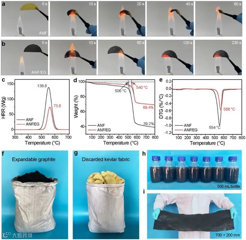 除了性能测试外,研究团队还对这种混合膜的安全性和可扩展性进行了验证。在燃烧试验中,ANF/EG杂化膜表现出良好的热稳定性,其热释放速率远低于传统材料,显示出优异的防火性能。此外,该材料还可以通过简单的工艺实现大规模生产,满足不同应用场景的需求。