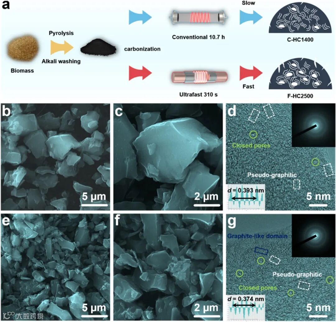 图1b-g的SEM和HRTEM:慢烧样C-HC1400,颗粒4–7 μm,类石墨微区明显,层间距0.393 nm。快烧样F-HC2500,颗粒2–5 μm(热应力炸碎的),层间距0.374 nm,但孔更多。