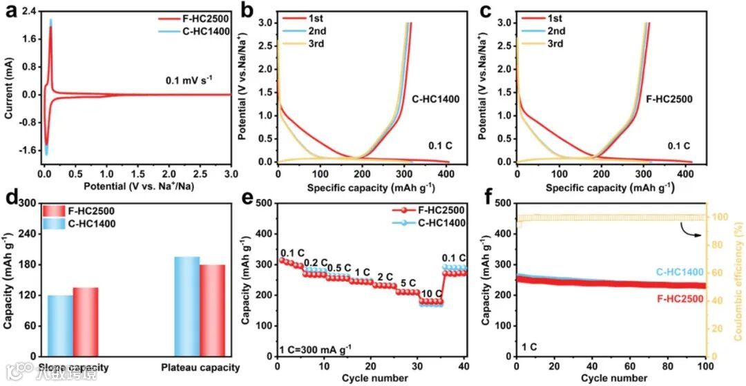 0.1 C下,两样品容量差不多(315 vs 316 mAh/g),首效也接近(76% vs 78%)。但把容量按电压拆开(图3d):>0.1 V的斜坡区(缺陷吸附),快烧样135.3 mAh/g,高于慢烧样的120.3——缺陷多,吸附自然多。<0.1 V的平台区,快烧样179.7 mAh/g,低于慢烧样的195.7——层间距小,嵌入少。