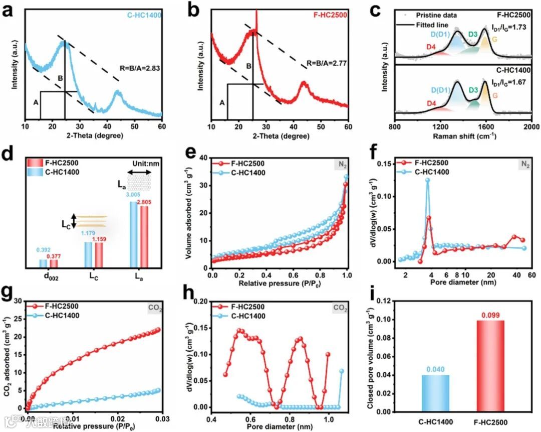 快烧样F-HC2500,闭孔孔容0.099 cm³/g,闭孔填充贡献率33.7%;慢烧样C-HC1400,层间距大,嵌入贡献77.1%,填充只占12.4%。
