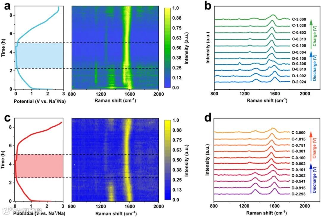 原位拉曼盯着首周放电过程看。慢烧样C-HC1400(图5a-b),电压从0.619 V降到0.10 V,G峰分裂成1537 cm⁻¹和1602 cm⁻¹——这是钠-石墨插层化合物的特征峰,钠确实钻进层间了。