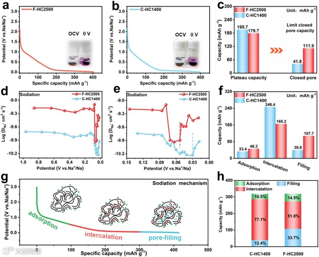 最后把容量全拆开(图6f-h):快烧样F-HC2500,吸附14.5%、嵌入51.8%、填充33.7%——三阶段均衡贡献。慢烧样C-HC1400,嵌入77.1%、填充12.4%——嵌入当家。